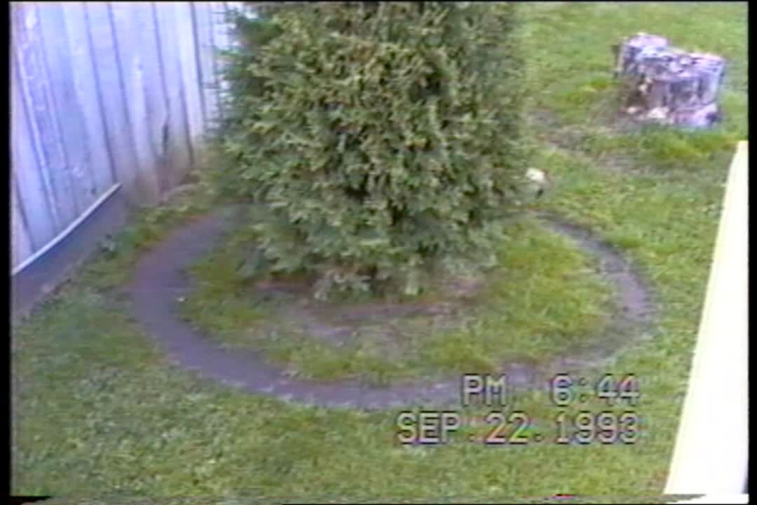 Dog runs circles around tree.