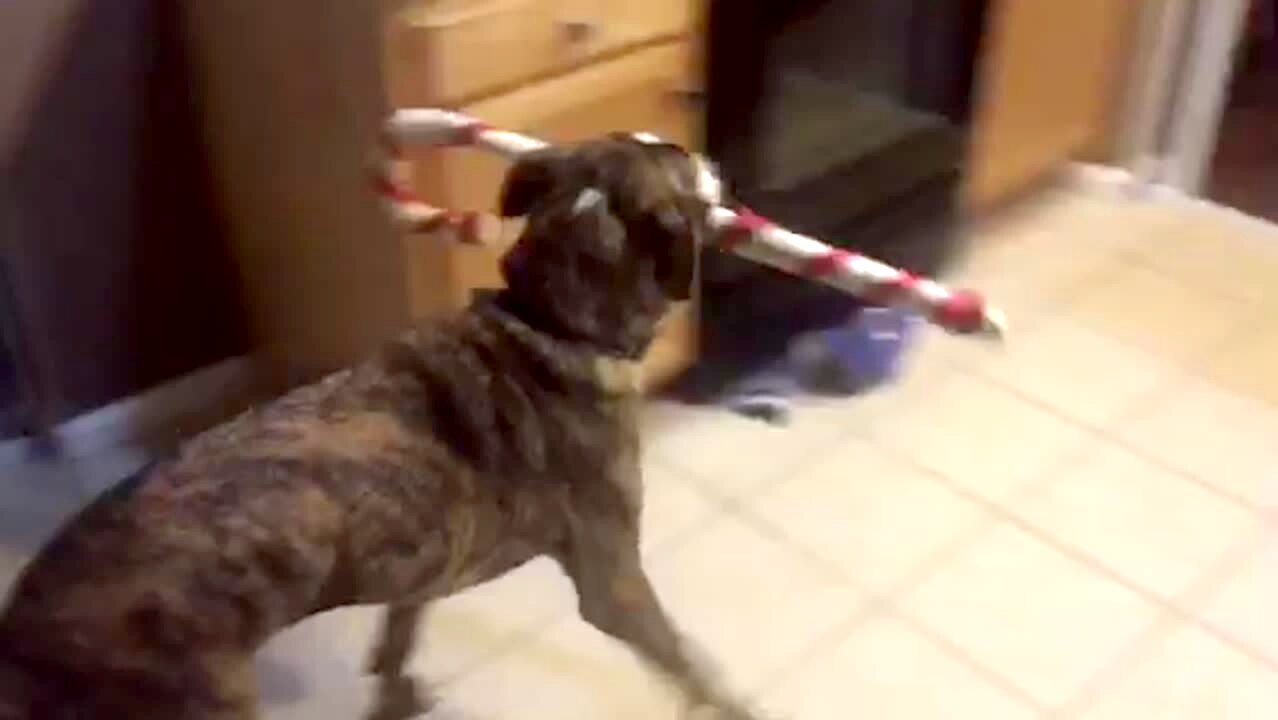 A shepherd dog walks back and forth in the kitchen between two pet gates and whines because he can't fix a large candy cane decoration through either of them.