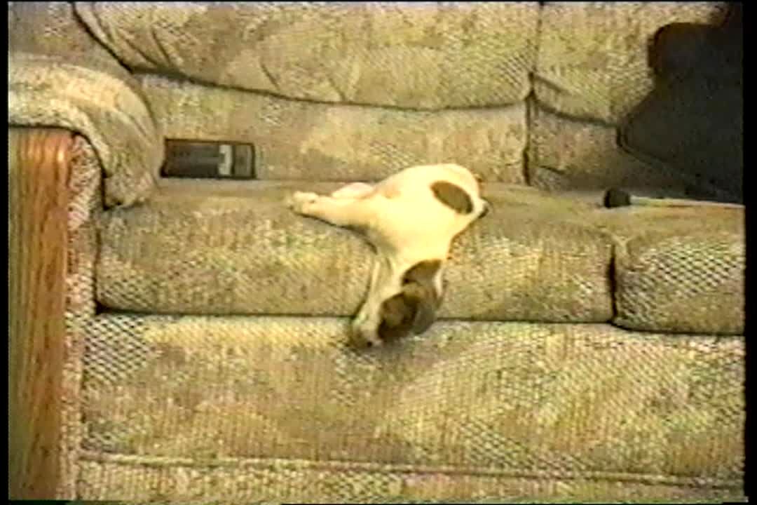 A dog crawls out from under the cushions of a leather sofa as the woman behind the camera coaxes her out.