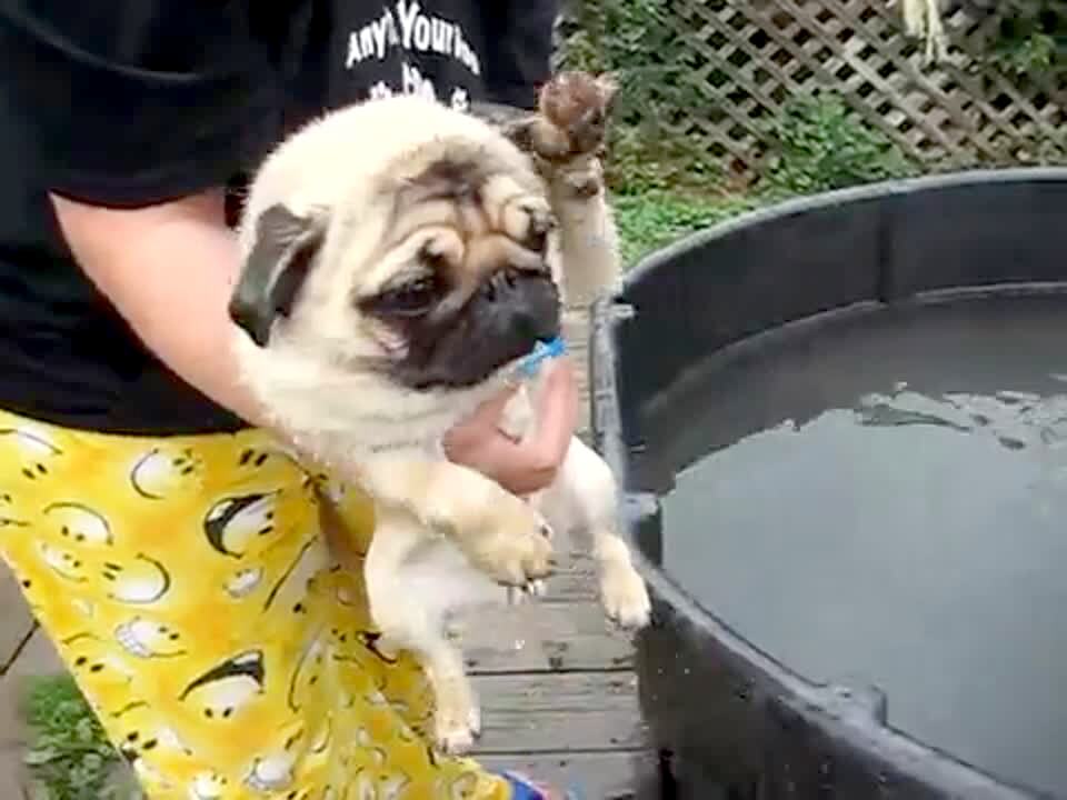2 pugs tilt their heads when man whistles off-camera. Shot from above the dog's heads. Long for edit.