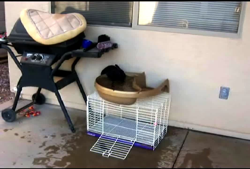 A ball is thrown on top of a dog cage. A yorkie dog sniffs at the ball, paws open the cage, goes inside, hits the ball off the top of the cage from inside, and chases after it. Pets.