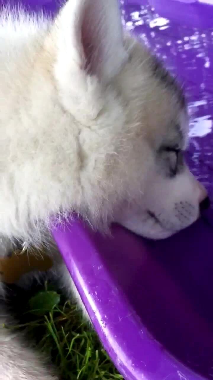 Puppy falls asleep with face in a water bowl. Blows bubbles as he breathes in and out.