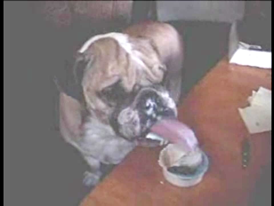 Bulldog eats ice cream out of a container while sitting at dining room table.