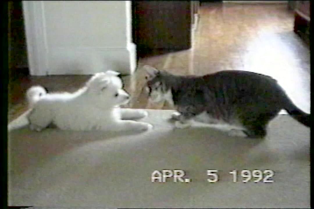 Tiny little puppy dog runs crazy circles around big fluffy white cat, cute