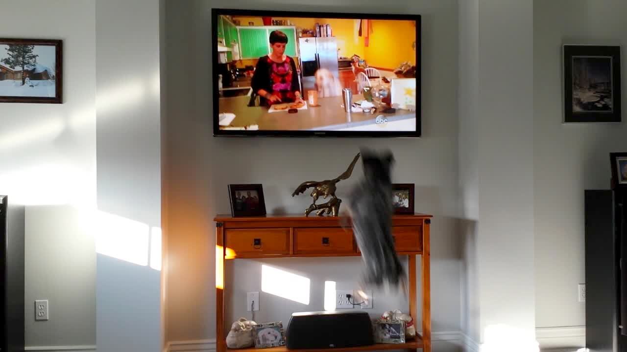 An Australian Cattle dog indoors repeatedly jumps and barks while watching AFV clips of animals jumping.