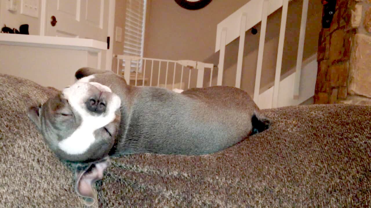 A Boston Terrier puppy dog falls asleep on a couch indoors. It rolls over, falls down, and wakes up.