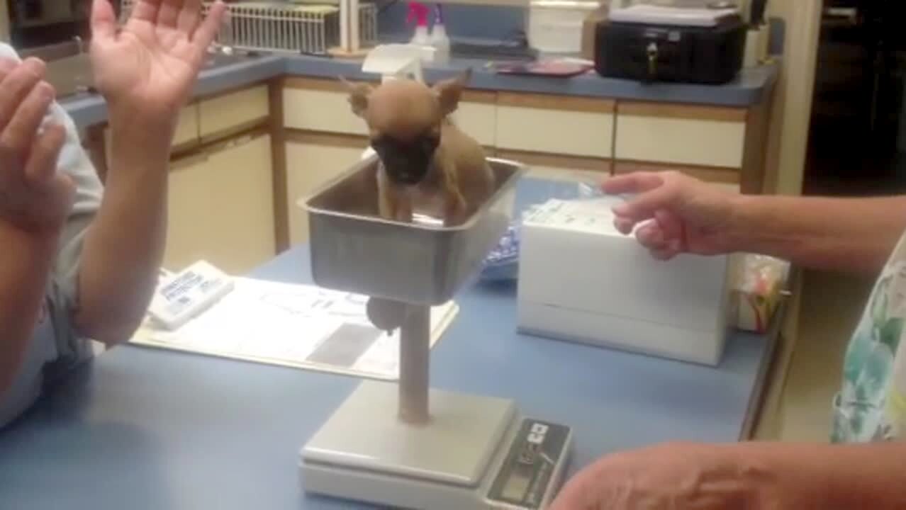 A chihuahua puppy dog wags its tail and shakes on a small scale in a vet's office.