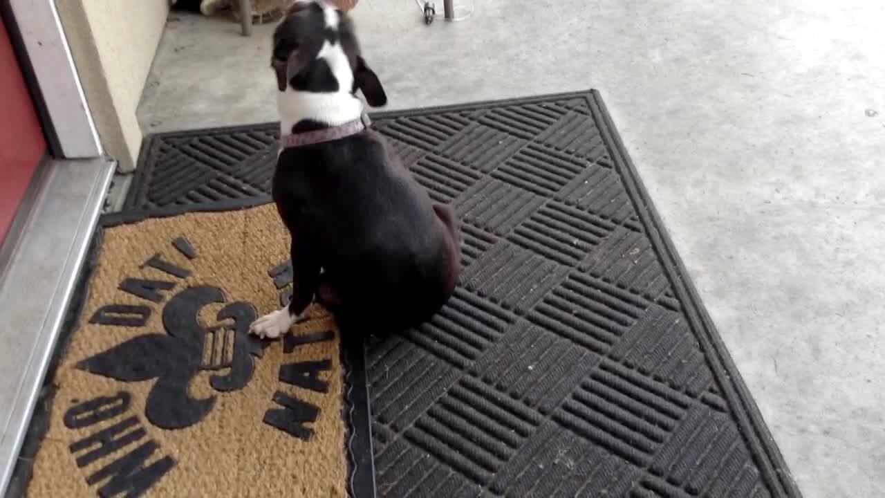 A Boston Terrier dog sits on a doormat outdoors and spins on its butt to scratch an itch. A man and woman are audible.