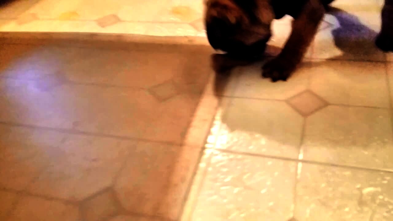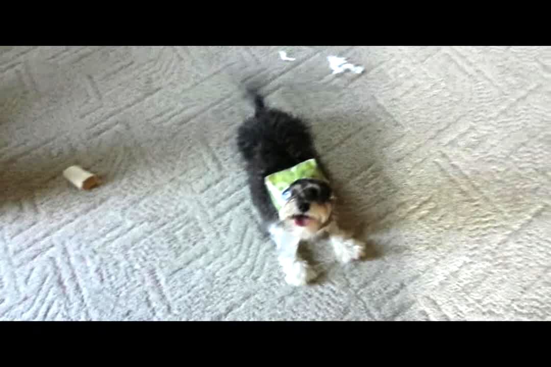 A pug puppy dog in a dress slips around on the floor while playing with a treat indoors. A French man narrates.
