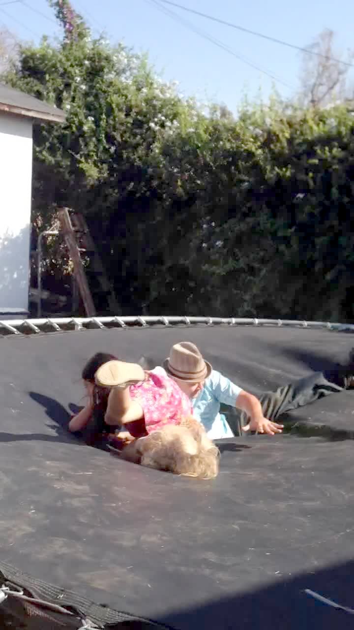 A man, his daughter and dog jump on a trampoline when the trampoline rips and the man falls through.