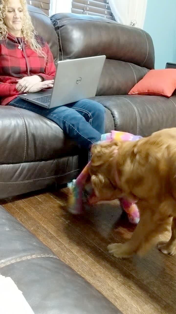 Shaggy brown dog kicks leg as woman brushes its side on couch. UGC-EP experienced an error.