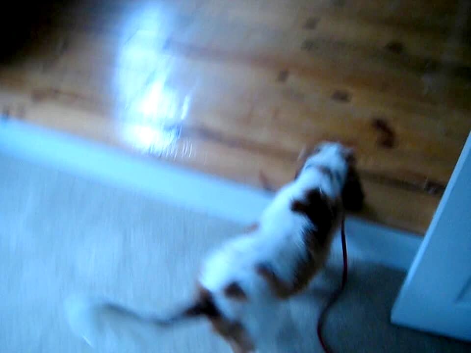 Big Sheepdog knocks small brown dog over with its butt in living room. Short.