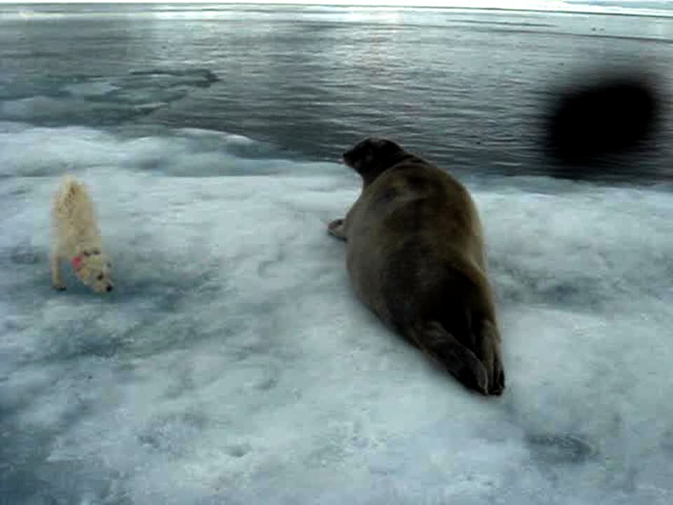 A small mix breed dog barks at and chases a large bearded seal on an ice berg covered in ice and snow in the ocean. The seal jumps off the ice berg and swims away.