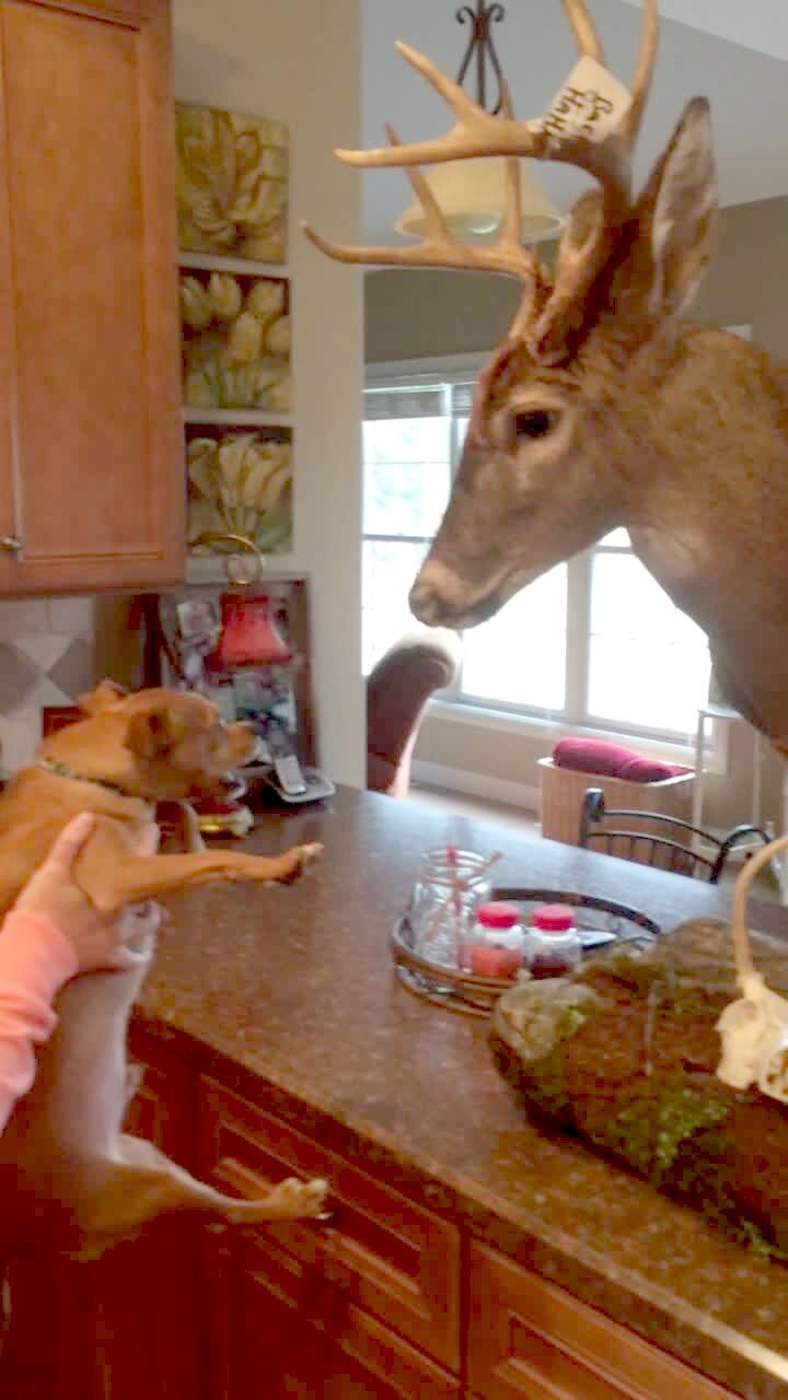 A chihuahua dog growls repeatedly at a mounted deer head indoors.