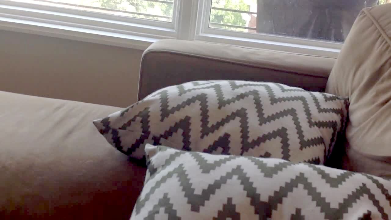 A Yorkshire Terrier dog barks and jumps repeatedly onto a couch but can't make it up indoors. Another Terrier sits calmly on the couch and just looks at the jumping dog.