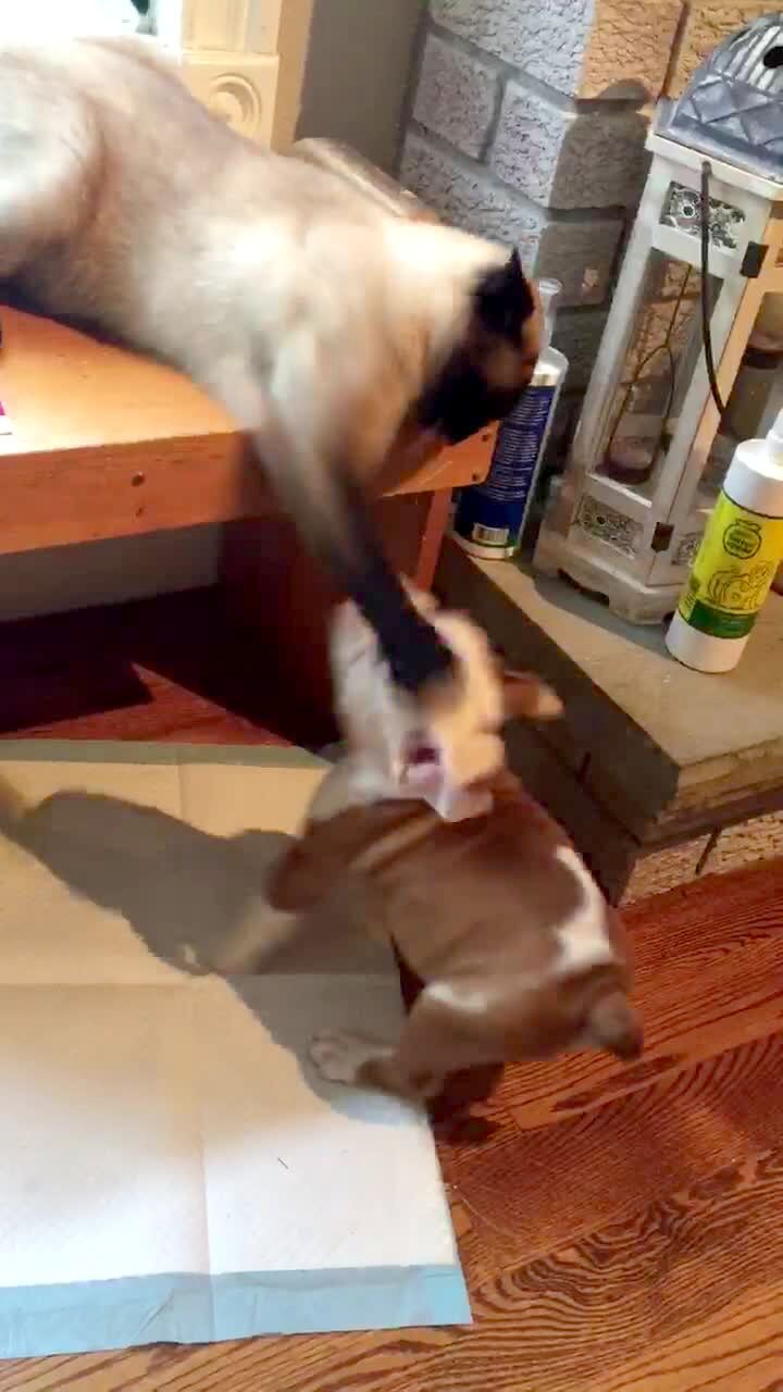 A cat carries a dog treat in his mouth, jumps off a fridge, balances on a kitchen counter, and drops it on the floor for a black lab puppy dog to eat indoors.