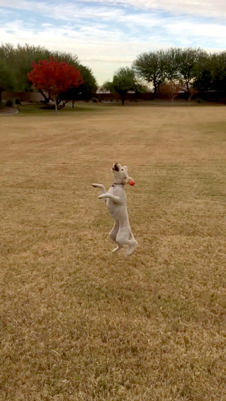 A dog jumps for a ball in slow motion but misses it and falls back down to the ground outdoors.