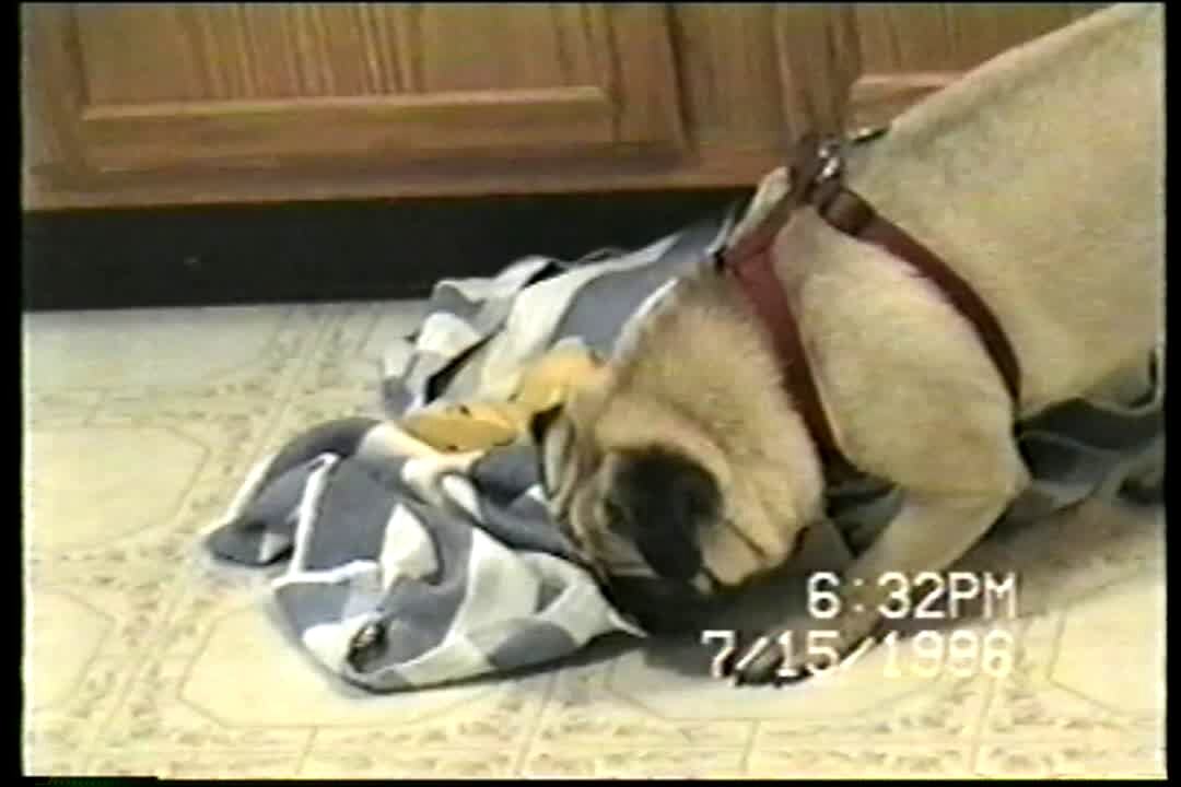 "Petrified Puppy Presentation" Teen girls are surprised by parents when they open their eyes and see they have been given a puppy. They scream and scare the puppy who falls off the table.
