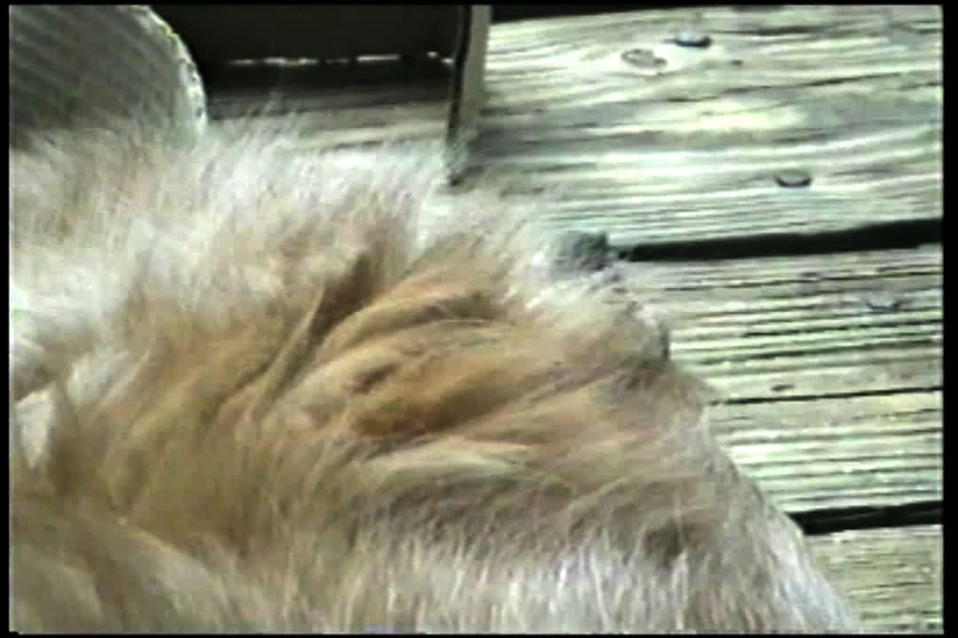 Dog lays in sliding glass doorway. Blue bird flies over, pecks at hair on dog's butt, gathers pieces of fur for nest. Dog doesn't move or react at all. Odd.