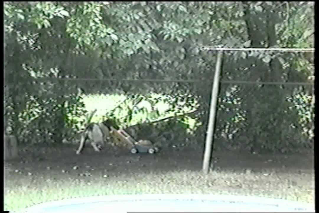 Dog is pushing a toy lawn mower, looks like he is mowing.