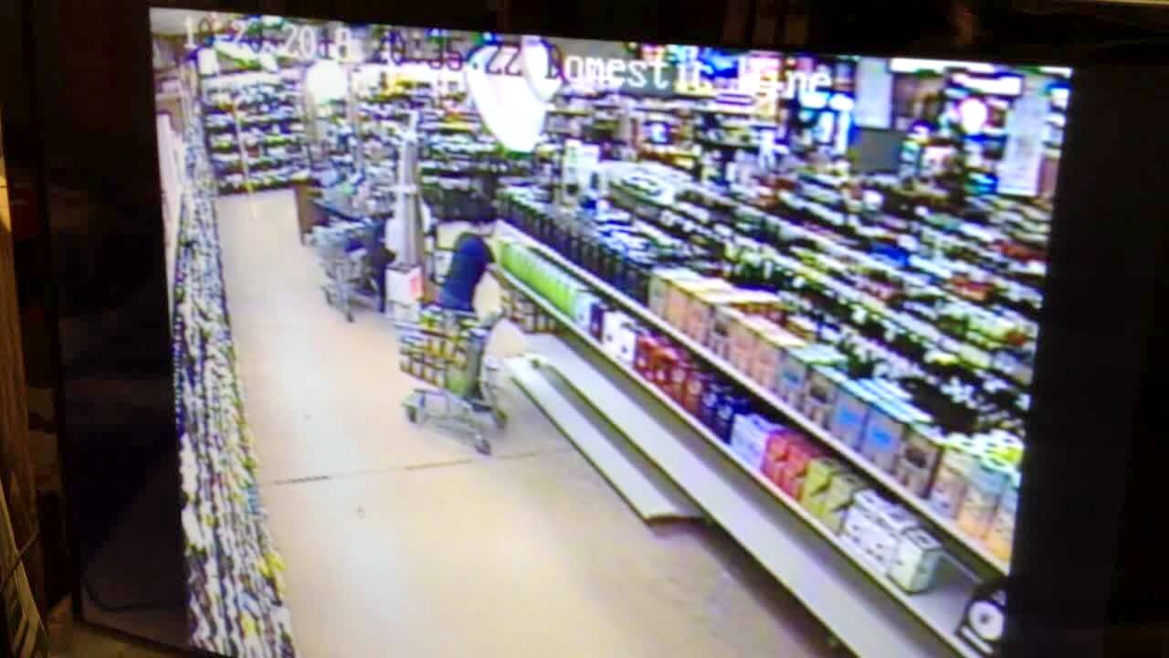 A woman stacks box wine in a liquor store shelf, and the whole aisle of shelves collapses. Submitted was asked to resubmit footage.