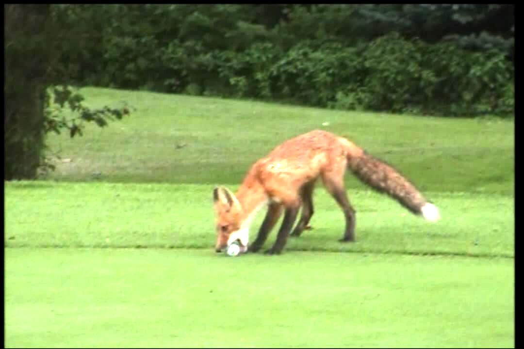 A man with the camera on a golf course watches a bug push his golf ball toward the hole. The man says "It's gonna be a birdie. Help me bug!" and the bug pushes the ball into the hole and the man celebrates with his friend.