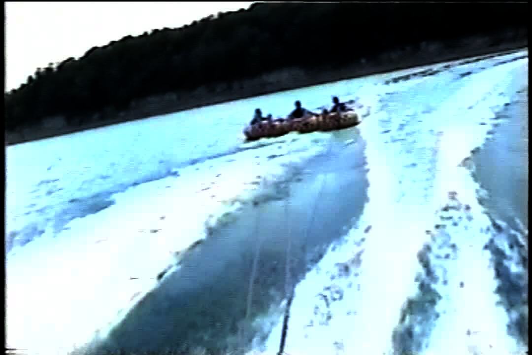 Boy & girl are in inflatable raft, pulled behind a boat. They try to jump a sand mound on the shore but both kids get thrown out of the raft into the lake.