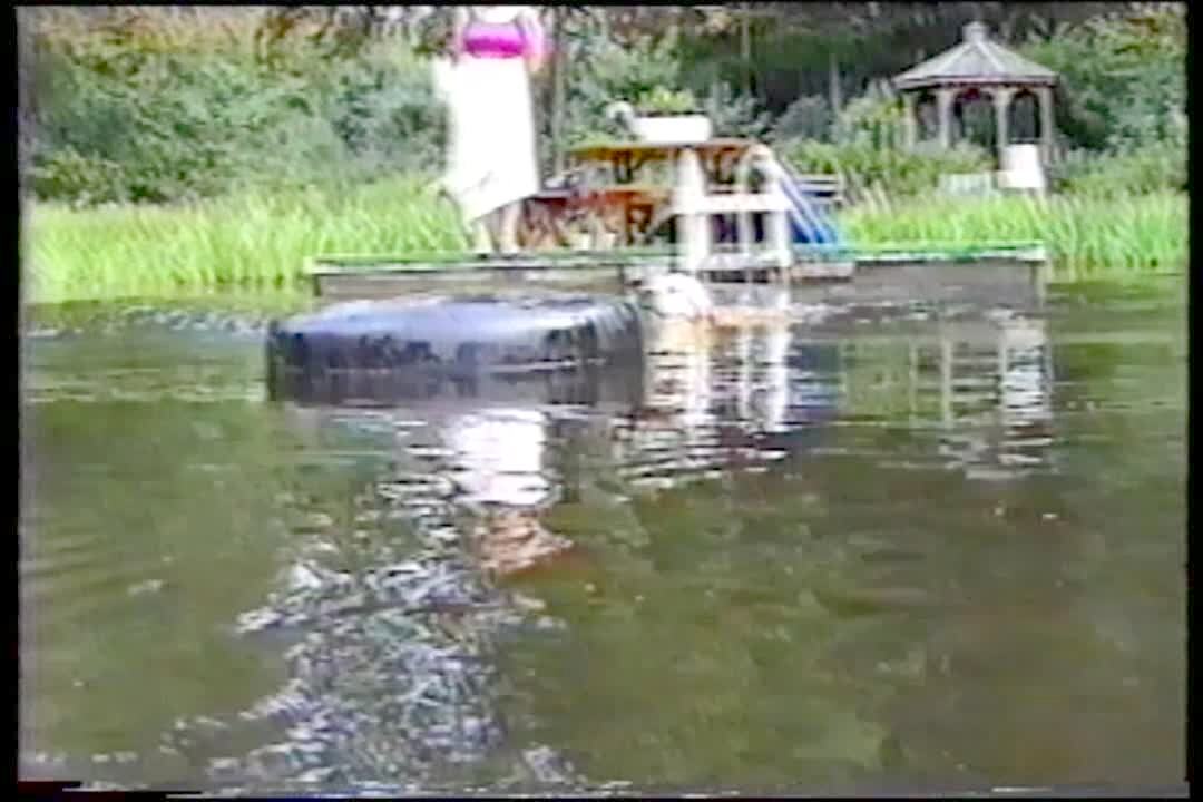 Two men jump onto a large inflatable raft and bounce / launch a boy into the lake. He cries. Short heads