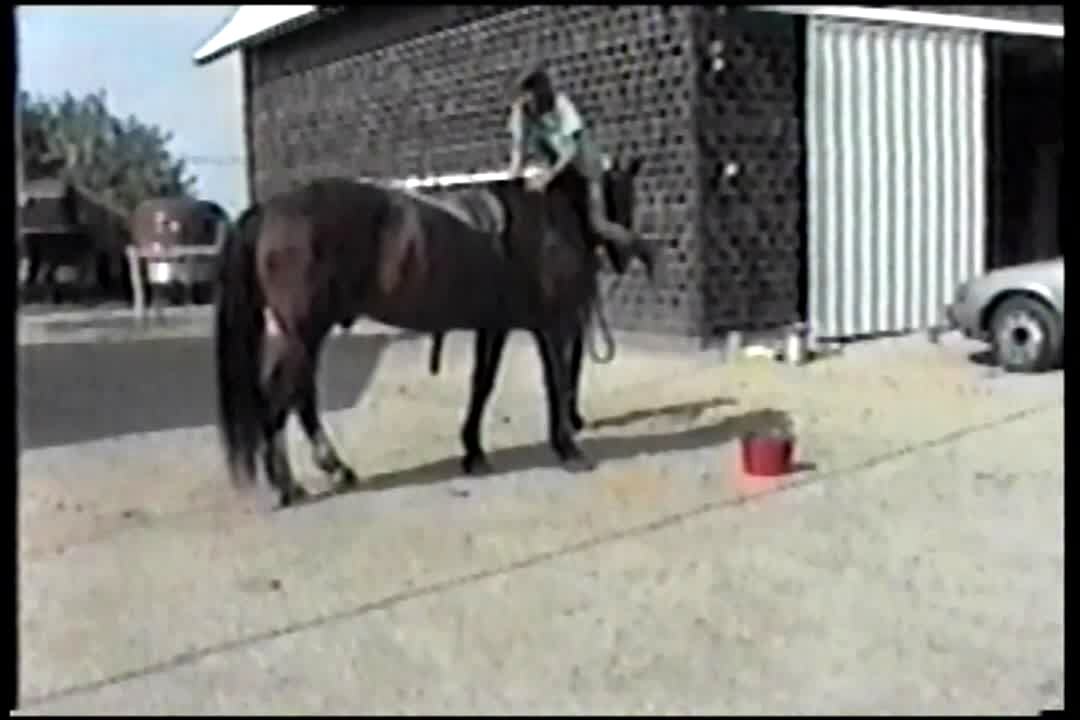 Woman tries to mount horse by climbing its neck. Horse picks up woman and flips her on his back, she falls off. *tracking off