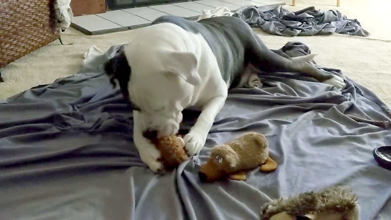 A dog chews on a squeaky toy and once it squeaks, a chihuahua dog stands up in front of the camera from out of frame.