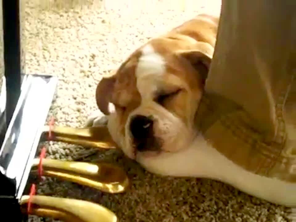 Small brown & white puppy dog sleeps on someone's foot while they play piano. Their foot goes up & down on the pedal.