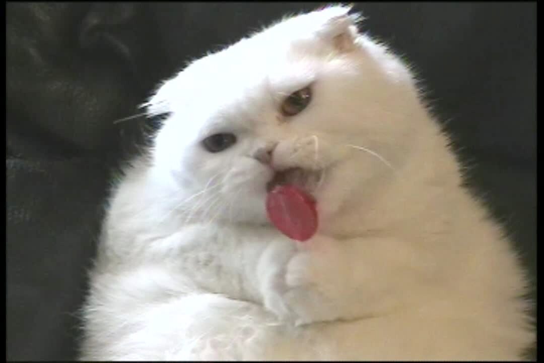 Cat sits upright in a chair, licks lollipop with plate of food in front of it, too.