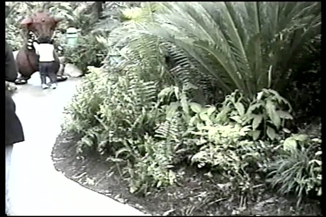 8 year old girl runs up to dinosaur at Disneyland. It scares her when it moves and she cries.