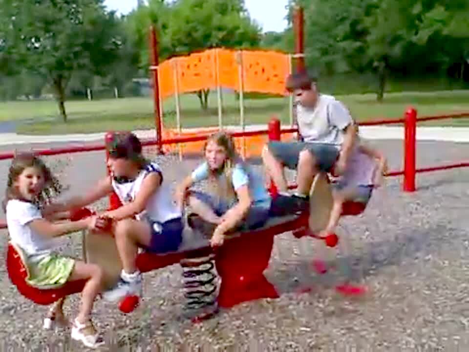 5 kids ride on teeter totter at the park. Boy stands up & hits his crotch / groin. Playground. Seesaw.