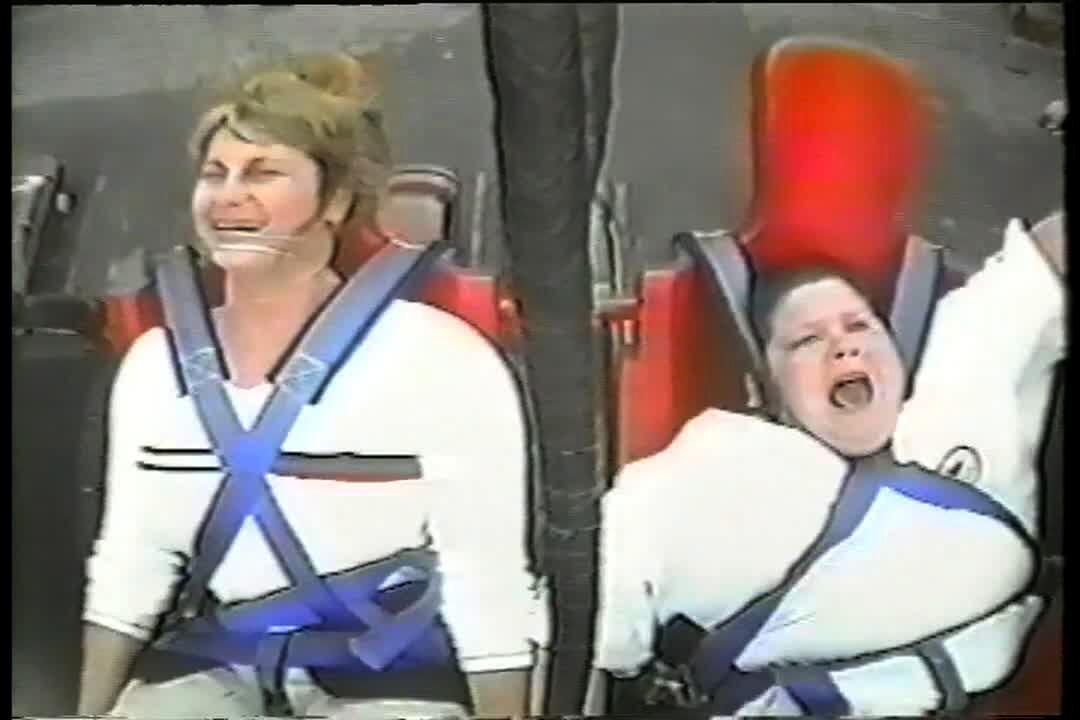 "Slidin' Rider" Slingshot ride amusement park -- boy almost falls out of chair. Keeps screaming "Janice, help me."