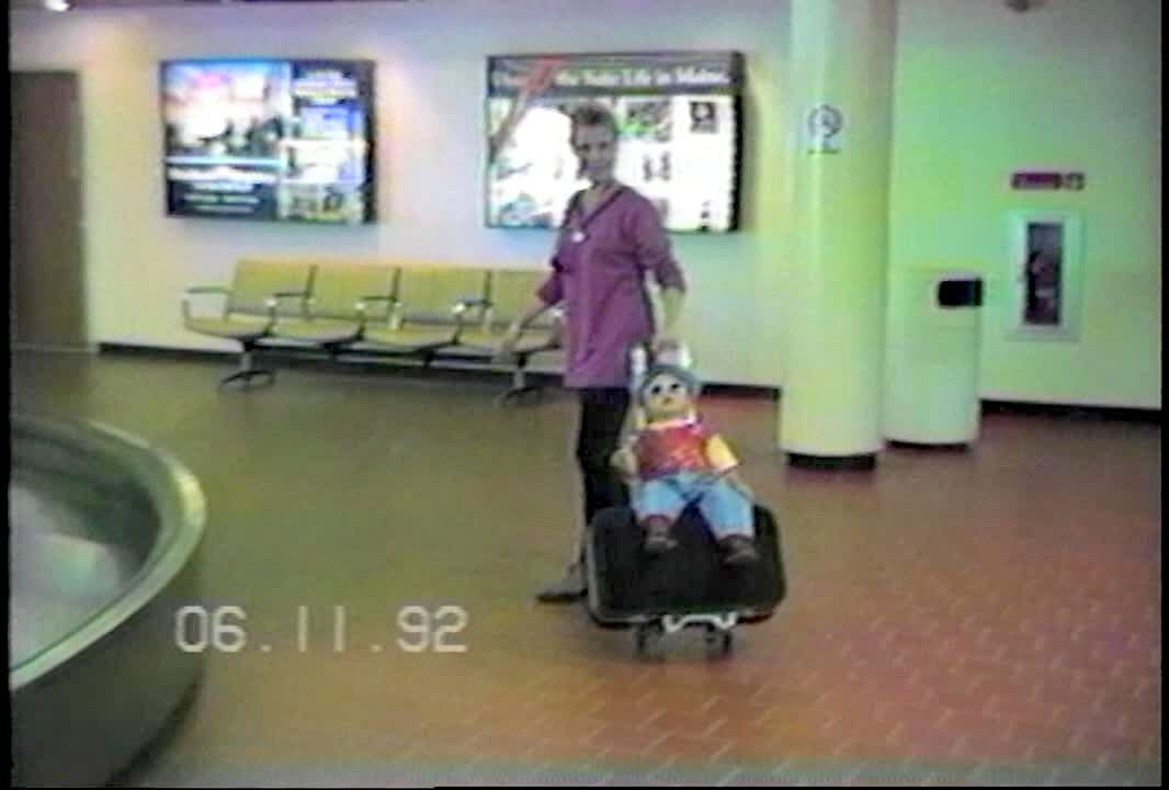 Luggage boy. Boy carried off, says good bye, while riding on luggage rack.