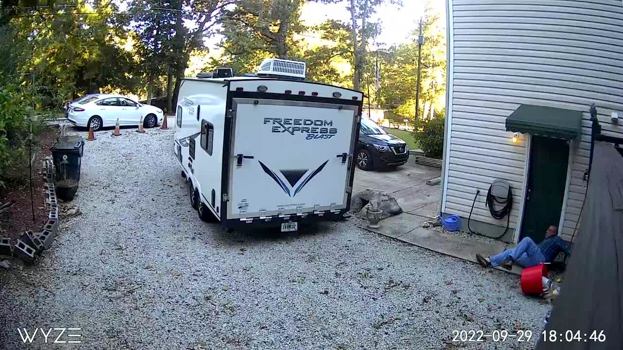 A man carries a bucket of stuff from an RV. He trips over a rock and slams into a wall. Security Camera Footage.