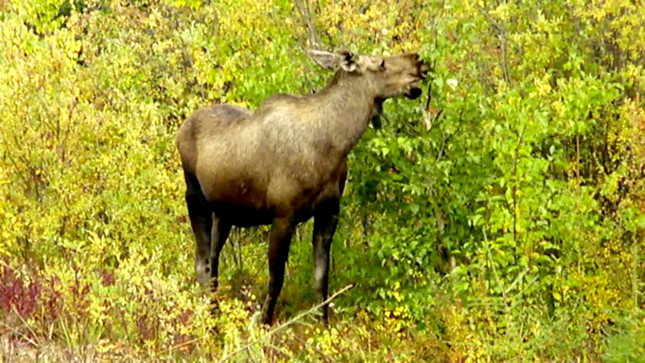 A small dog chases a large moose outdoors as the moose grazes and eats grass.