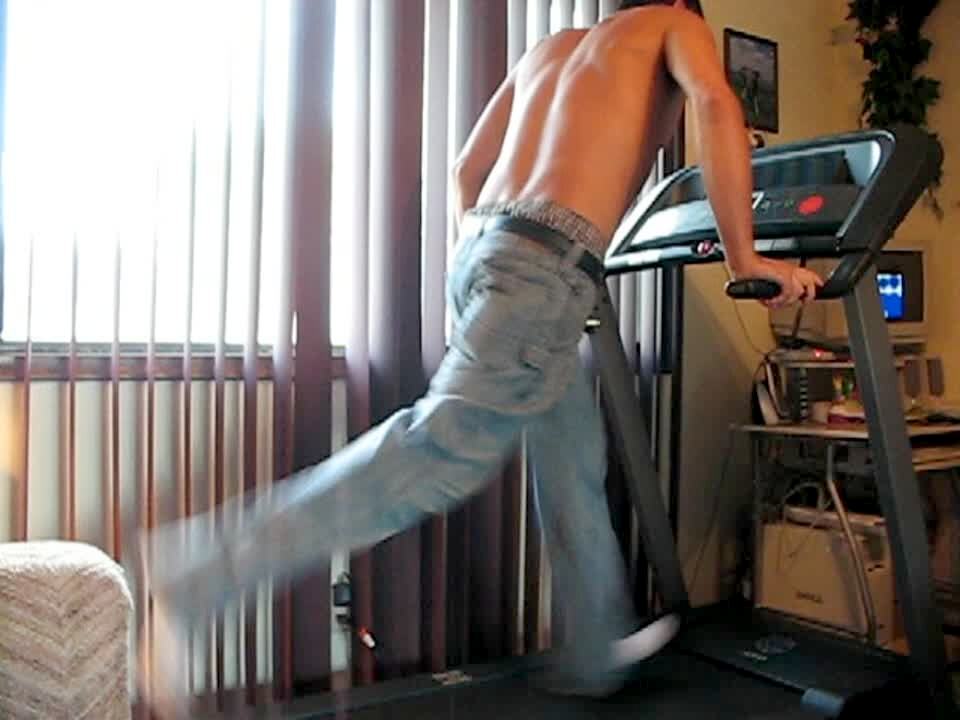 Shirtless man runs on treadmill as a pug dog rolls across the treadmill. Clip cuts out. NO tail.