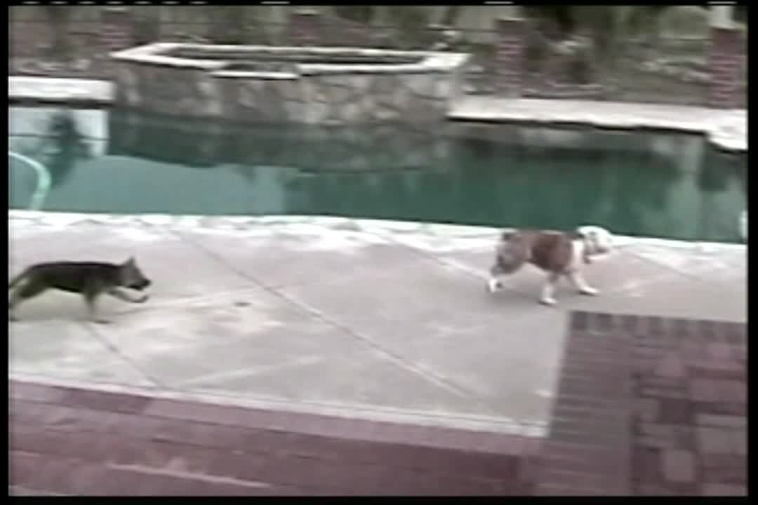 Two dogs run around in circles in the backyard. They don't see each other and collide / crash into each other hard.