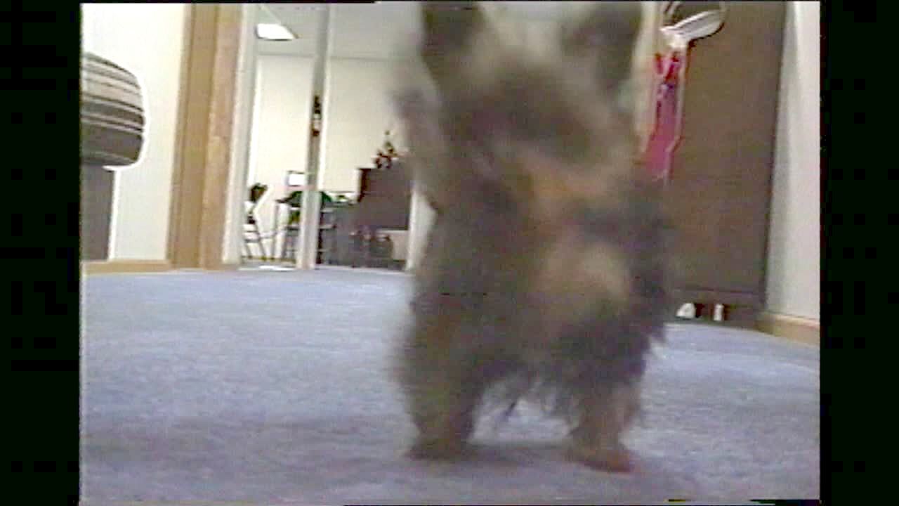 Hyper Scottie dog plays and runs around the house, gets close to the camera & barks.