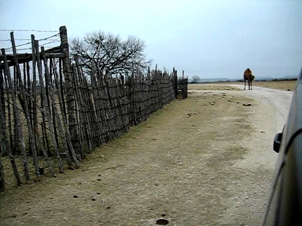 Camel chases car & sticks its head in the window to grab bag. Man screams go go go.