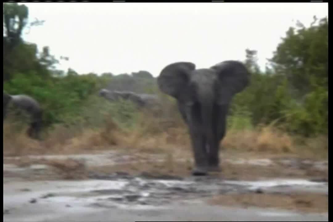 Elephant walks on muddy ground & charges at a car of spectators, but animal slips & falls on the mud. Safari, zoo.