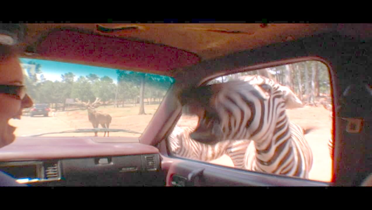 Zebra puts its head in a car at drive-through safari park. Family laughs, screams. Zoo.