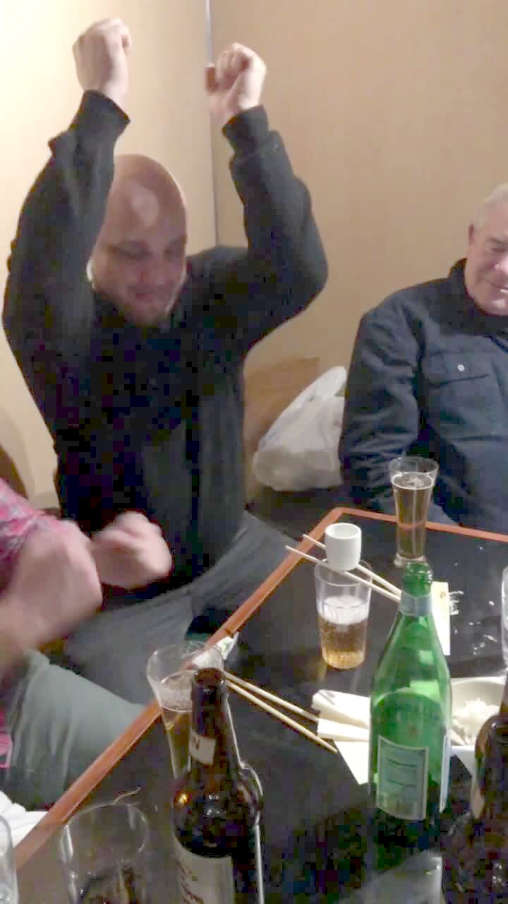 A man at a sushi restaurant hits the table to drop a sake bomb into his drink. Two other cups of beer fall over and pour onto his lap. The sake bomb stays intact.