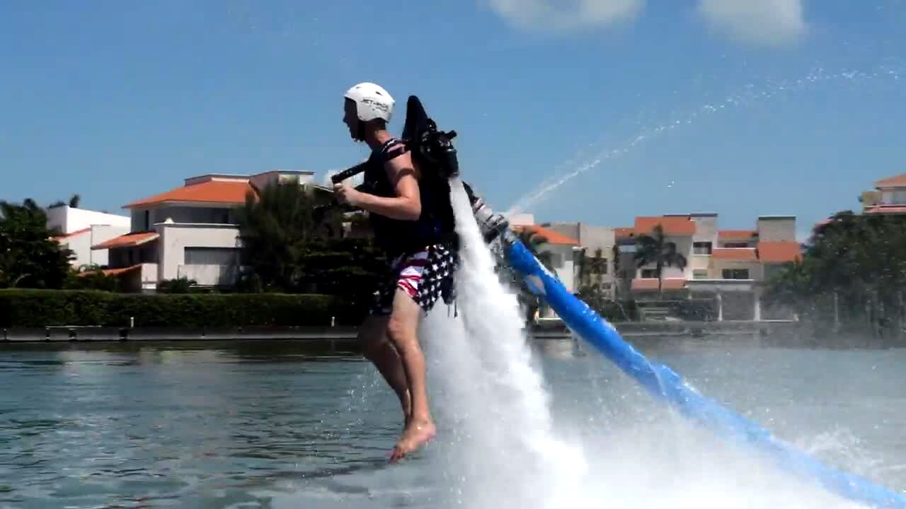 A senior an talks to the camera on a jet ski and gives instructions to the viewer for what to do if the jet ski flips over. While he's talking, the jet ski flips and he and the woman behind the camera fall in the water.