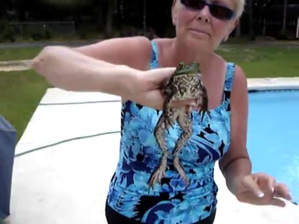 Woman holds large frog that makes high-pitched crying noises, sounds like a screeching cat. When she rubs its head, frog makes low growls. Woman laughs.