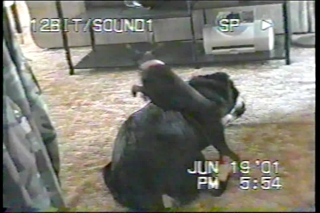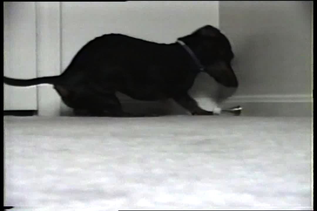 Bigger dog pulls Chihuahua by his dinosaur costume backwards around the kitchen floor. Halloween. Funny visual. Video gets very grainy & dark. SAME CLIP ON 4K-18 @ 18:25:48.