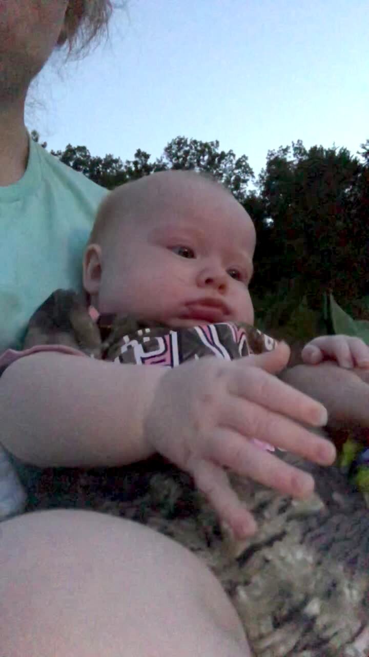 A woman has a baby on her lap outside. The baby cries when she sees fireworks on the fourth of July.