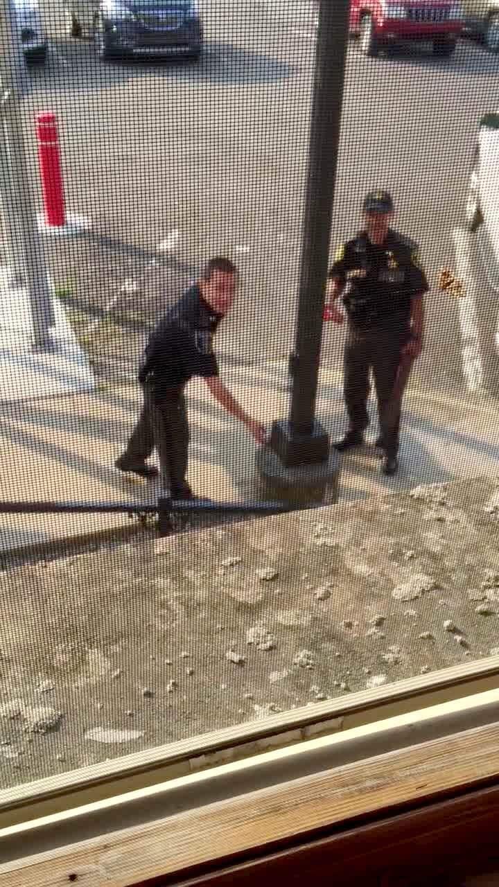 Two men, a sheriff and deputy, lift a panel on a street lamp to kill a wasps nest outdoors when the wasps scare them and one of them runs away, trips, and falls.